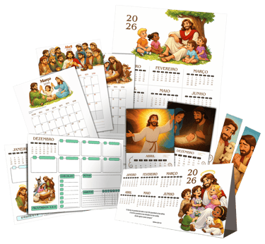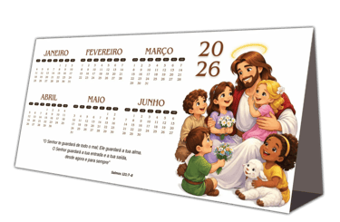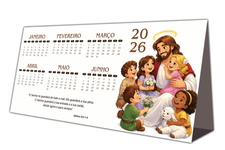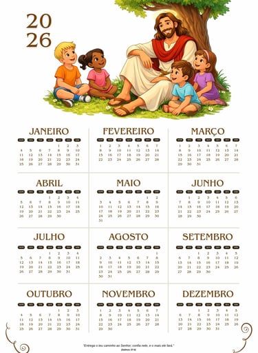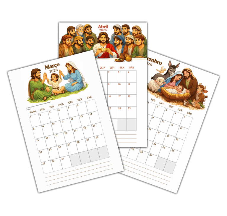 Calendário anual com todos os meses de 2026, trazendo organização clara, ilustrações cristãs inspiradoras e mensagens que convidam a começar cada mês com fé e propósito.