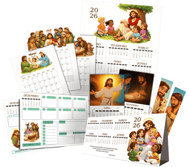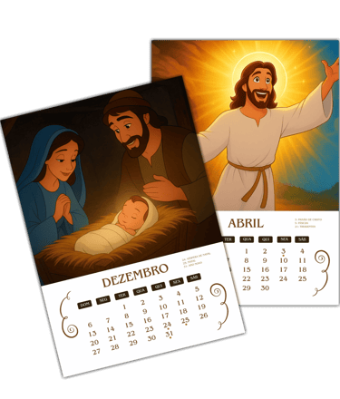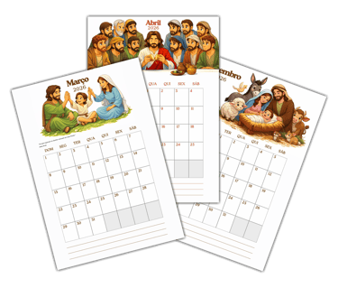 Calendário mensal com ilustrações cristãs exclusivas e as principais datas comemorativas do ano, para organizar cada mês com fé e equilíbrio.