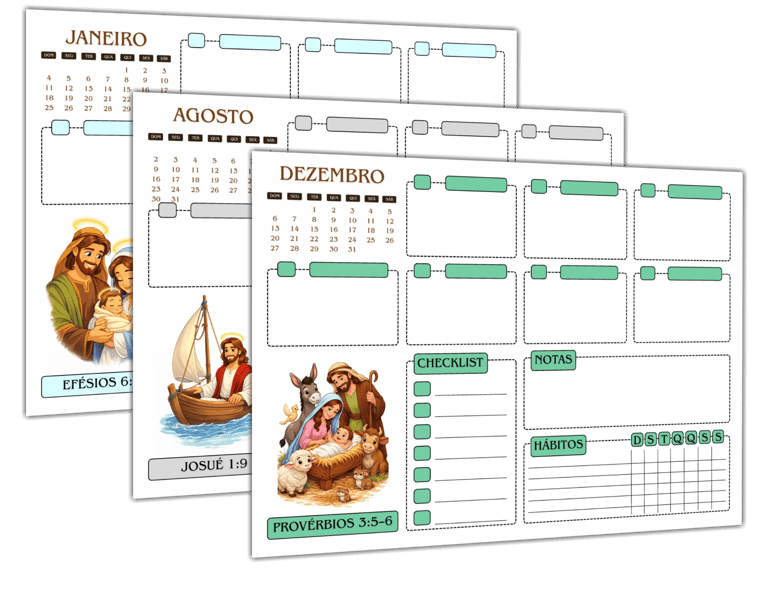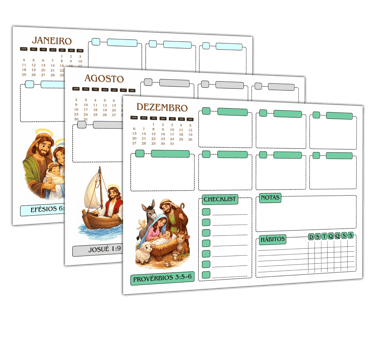 É um material digital que une organização e fé, ajudando você a planejar seus dias, registrar reflexões e se conectar com a Palavra de Deus ao longo de todo o ano, com ilustrações cristãs e mensagens inspiradoras para viver com propósito e paz.